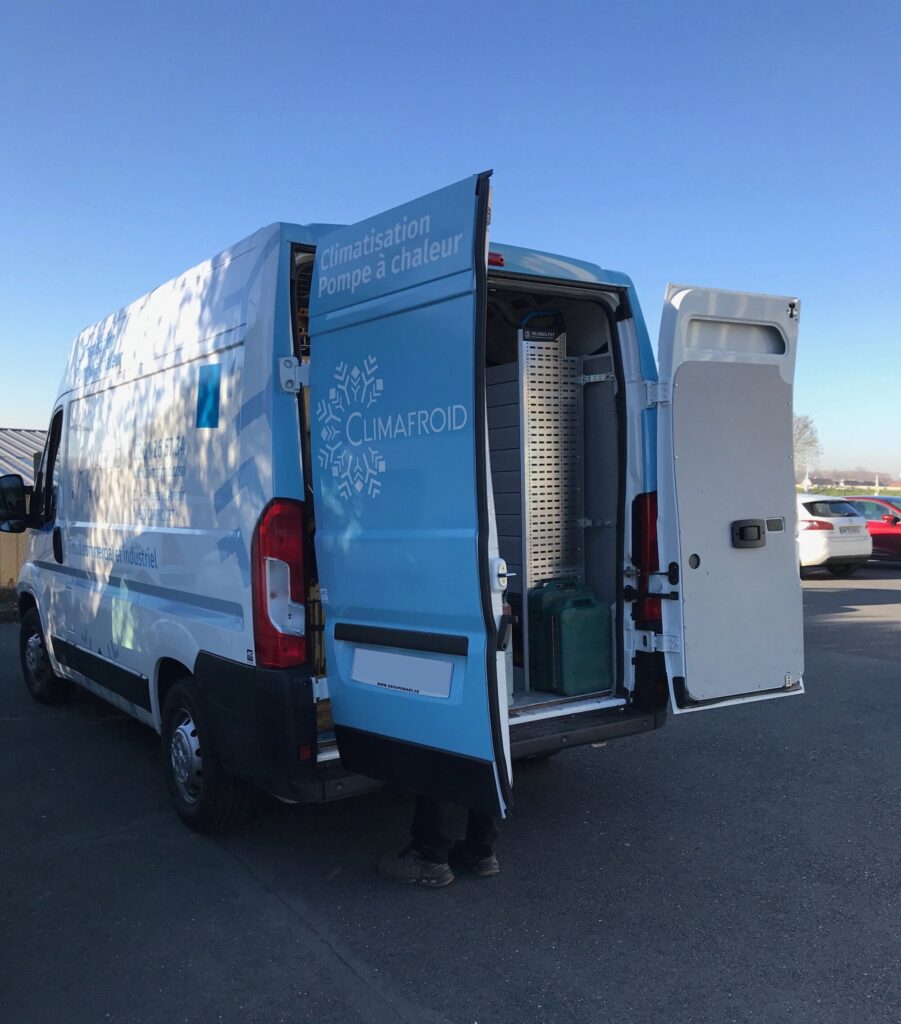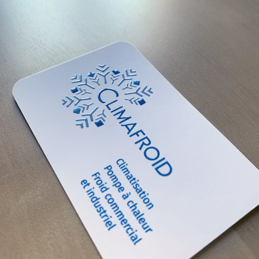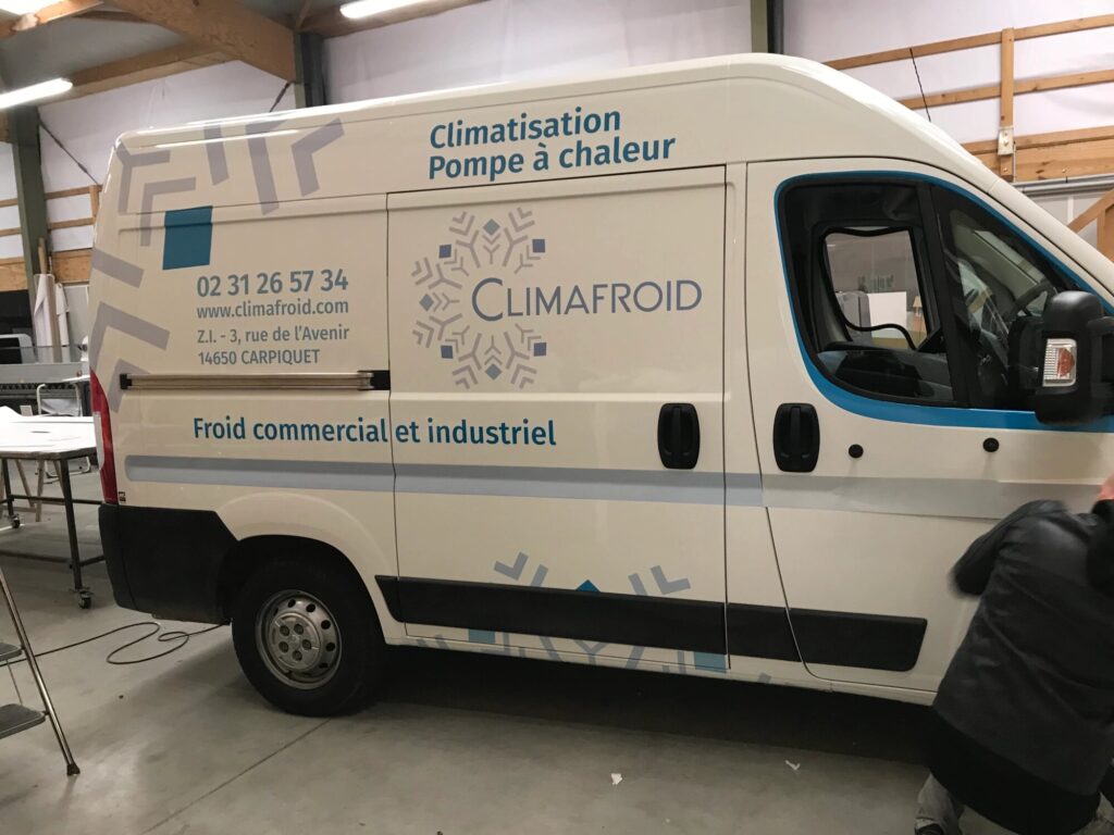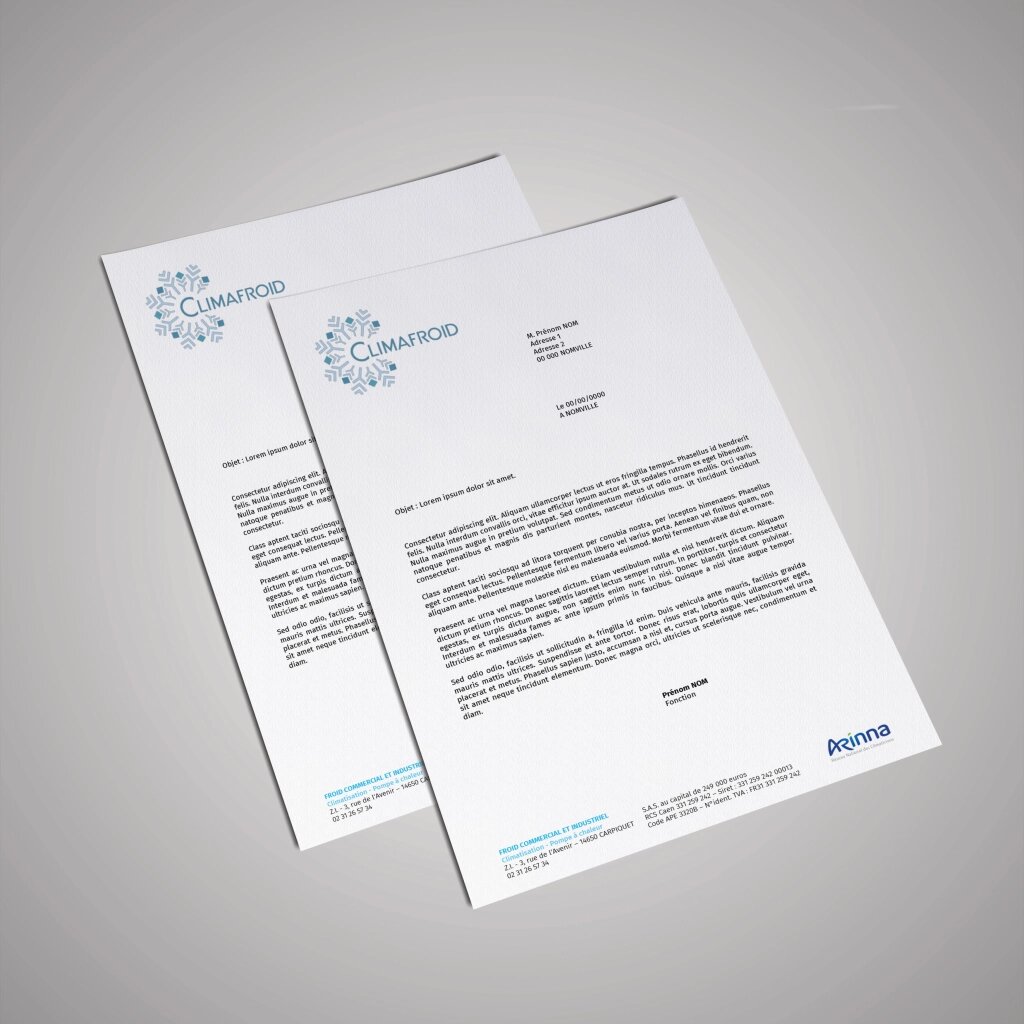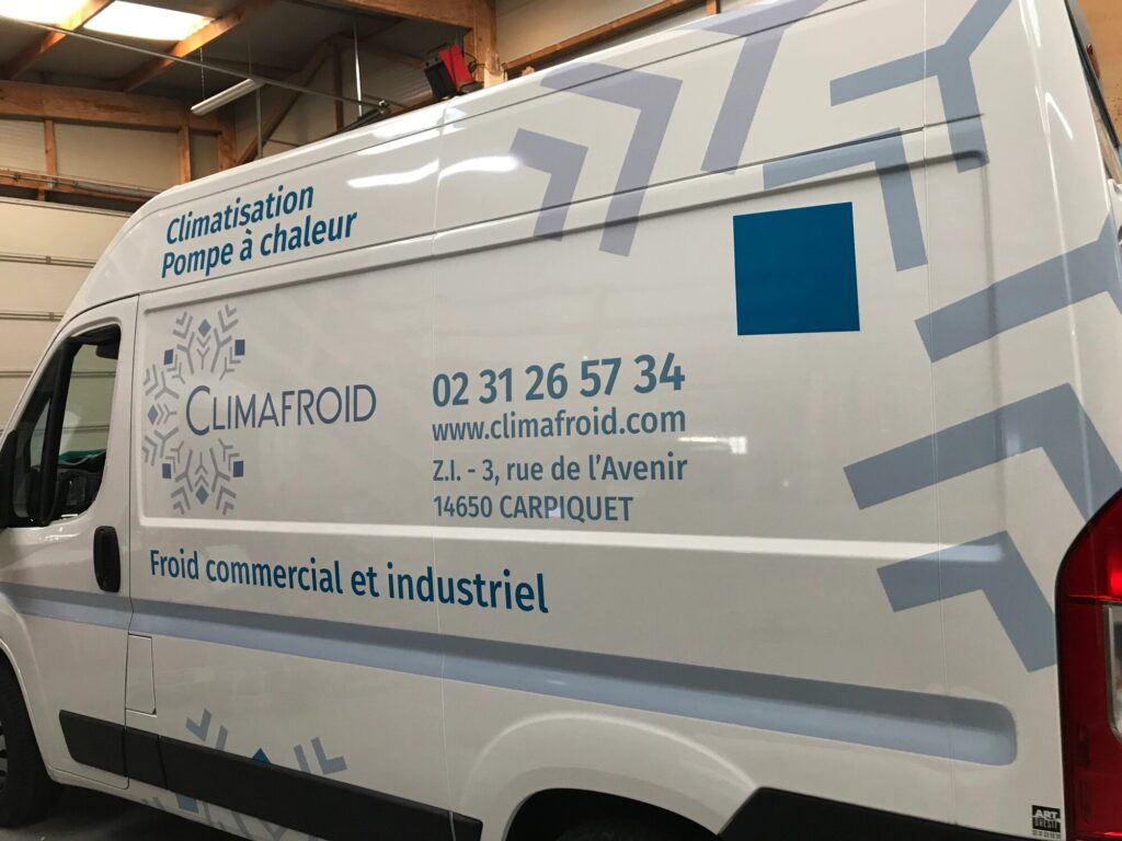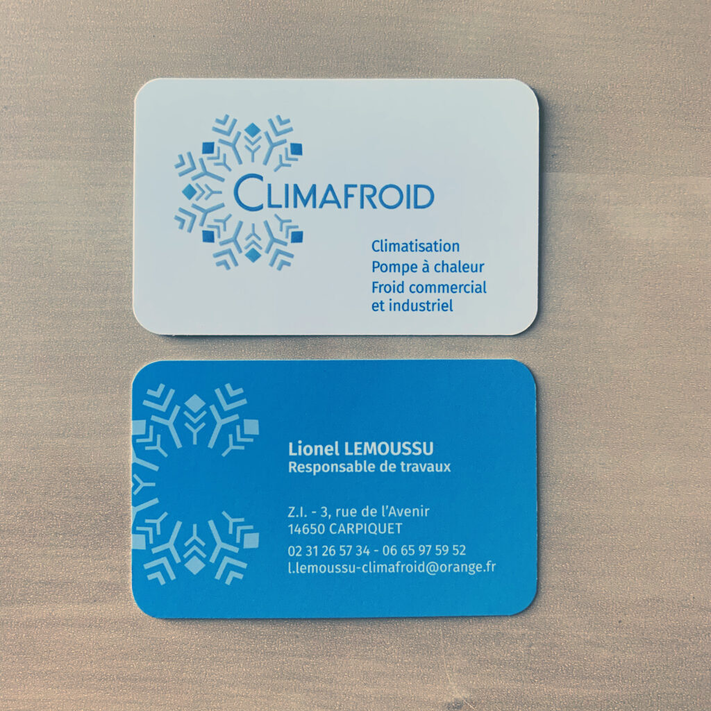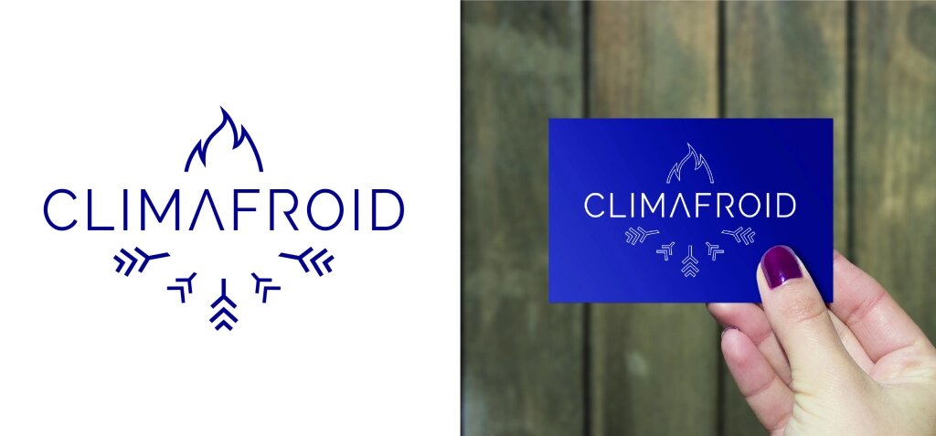 Relooking du logo Climafroid et conception de l’identité visuelle : logo, carte de visite, papier en-tête, étiquette, flocage de véhicule. Le logo, décliné en monochromie et signe graphique : Papeterie : carte de visite et papier en-tête Flocage de véhicule Deuxième proposition de logo non retenue