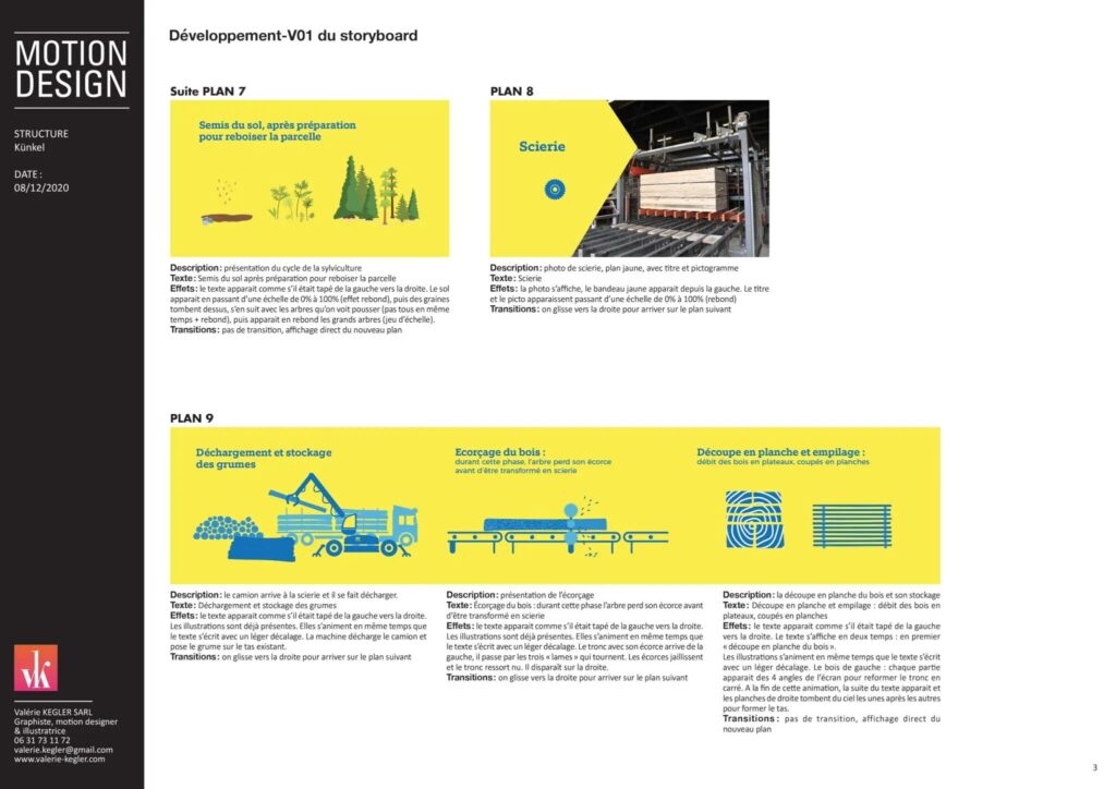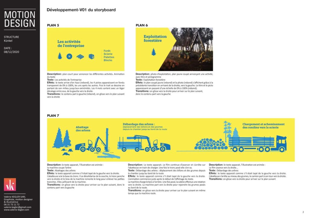Künkel est une entreprise ayant pour activité principale la fabrication de palettes. Mais voilà, ils en ont d’autres! Elles sont complémentaires et leurs permettent d’avoir une production vertueuse : forêt, scierie, palette, block palette et transport. Comment présenter cela simplement et dynamiquement? En vidéo, grâce au motion design, avec des illustrations et des textes animés. Le processus : après avoir établi un cahier des charges avec la cliente, elle m’a fourni un script qui déterminait les grandes lignes de la vidéo : quel contenu? Présenté dans quel ordre? Et comment (en illustration, en photo ou en texte)? Après quelques échanges et une fois validée, j’ai dessiné chaque plan, comme ci dessous. Sous chaque plan est indiqué la description, le texte qui est affiché, les effets et les transitions pour passer au plan suivant. Ainsi, le client voit à quoi cela va ressembler graphiquement et au niveau des animations. Après cette nouvelle validation, passage à l’animation et pour cela, je vous laisse découvrir la vidéo! En 1,30 min, vous avez tout compris! Plus besoin d’un long discours. A poster sur vos réseaux sociaux, en salle de réunion, tablette lors de vos RDV… Vous souhaitez vous aussi en savoir plus sur le motion? Présenter vos services, produits, entreprise… en captant l’attention de vos cibles? Contactez-moi!