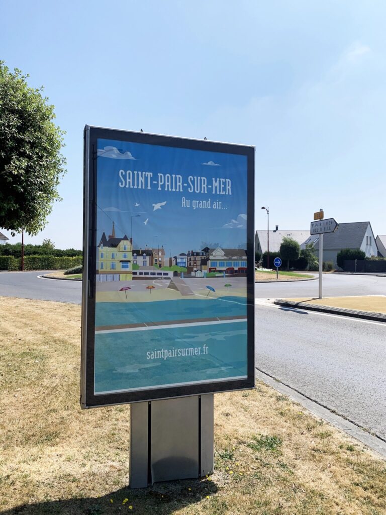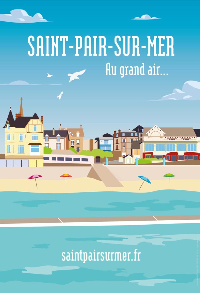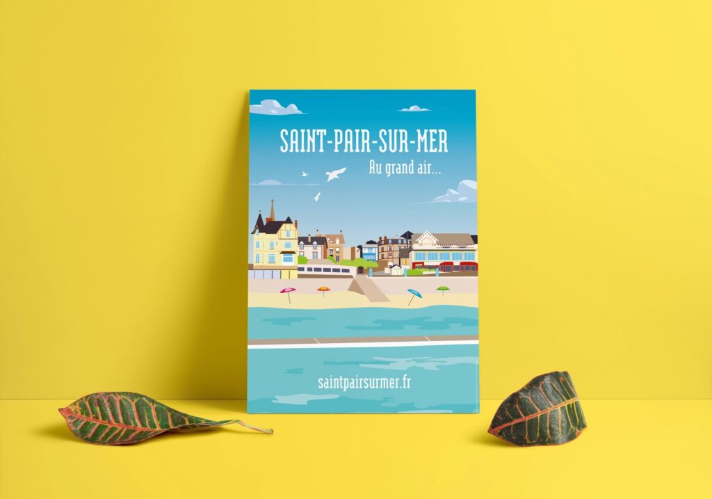 Réalisation d’une affiche et proposition de l’accroche « Saint-Pair-sur-Mer, au grand air… » pour valoriser la ville auprès des touristes. Suite au succès de ce visuel, l’affiche est disponible au format A3 sur la boutique. Ce projet est une belle aventure, car au delà du plaisir que j’ai eu à la réaliser, une partie des bénéfices, 2 € par affiche, seront reversés à l’association « L’arche de Léo » située à Saint-Pierre-Langers, juste à côté de Saint-Pair-sur-Mer. Cette association tenue par Eléonore est un refuge et sanctuaire pour animaux. Je suis contente d’aider à ma petite échelle, une autre jeune femme qui s’est lancée elle aussi dans sa passion et une belle passion. L’affiche est imprimée un peu plus loin, dans la Manche à Villedieu-Les-Poêles, par Renouvin. Ainsi, vous aurez une affiche Normande de Saint-Pair-sur-Mer : conçue, imprimée en Normandie et qui aidera une association Normande! (Et aussi, ma petite entreprise, Normande également!! ;)). Je remercie l’Office Culturel et la commune de Saint-Pair-sur-Mer pour leur soutien et leur fidélité. Ils font partis de mes tous premiers clients. Dessin de la vue depuis la mer, à partir de photos. Impression pour affichage poster et panneau.