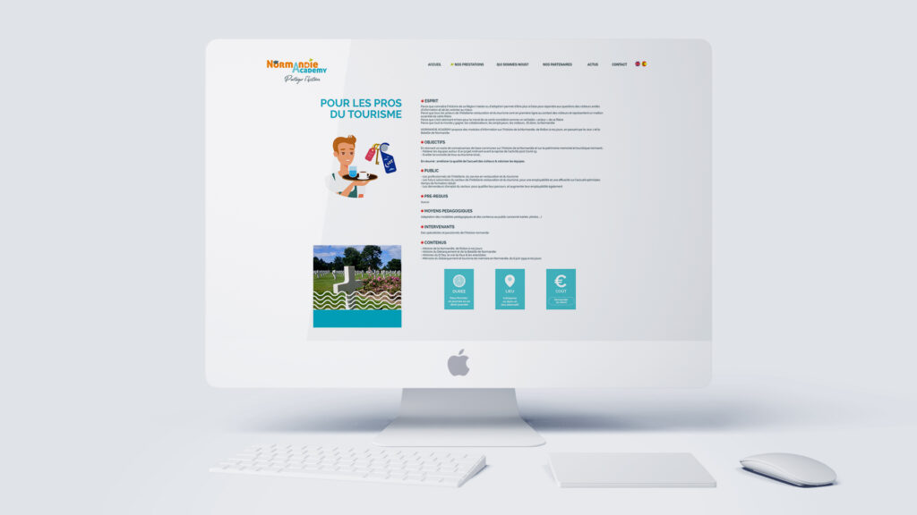 Création de l’identité visuelle pour Nathalie lançant son entreprise : Normandie Académy. Quès aco? Normandie Académy propose aux professionnels du tourisme, aux étudiants et aux citoyens du monde d’en savoir plus sur la Normandie : son histoire, son patrimoine, sa culture… Ainsi, Nathalie m’a demandé de travailler sur la conception graphique de son identité visuelle : un logo, des illustrations sympathiques qui évitent les banques images impersonnelles et le design de son site Internet. Son site est à découvrir ici. Il a été développé par Pablo Gotor et son entreprise Gotor Web marketing. Le travail graphique, c’est dessous!