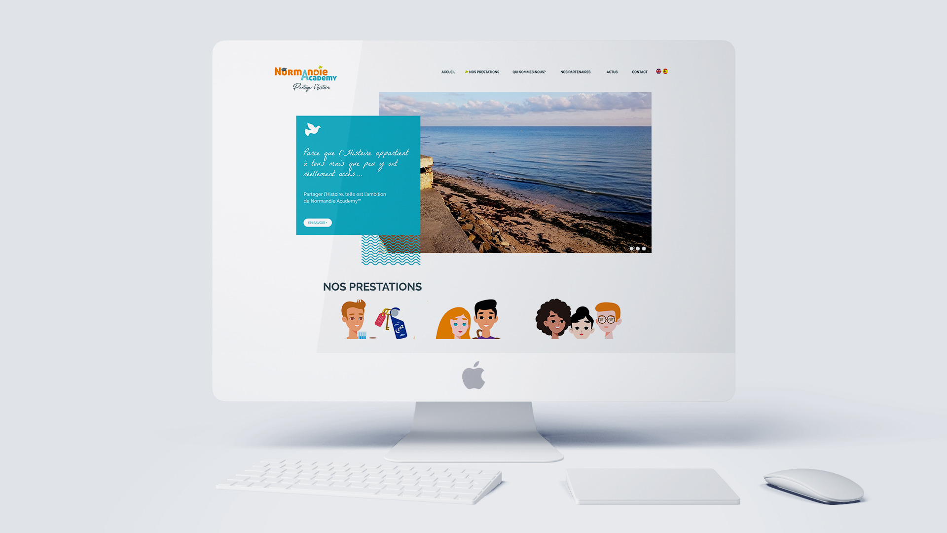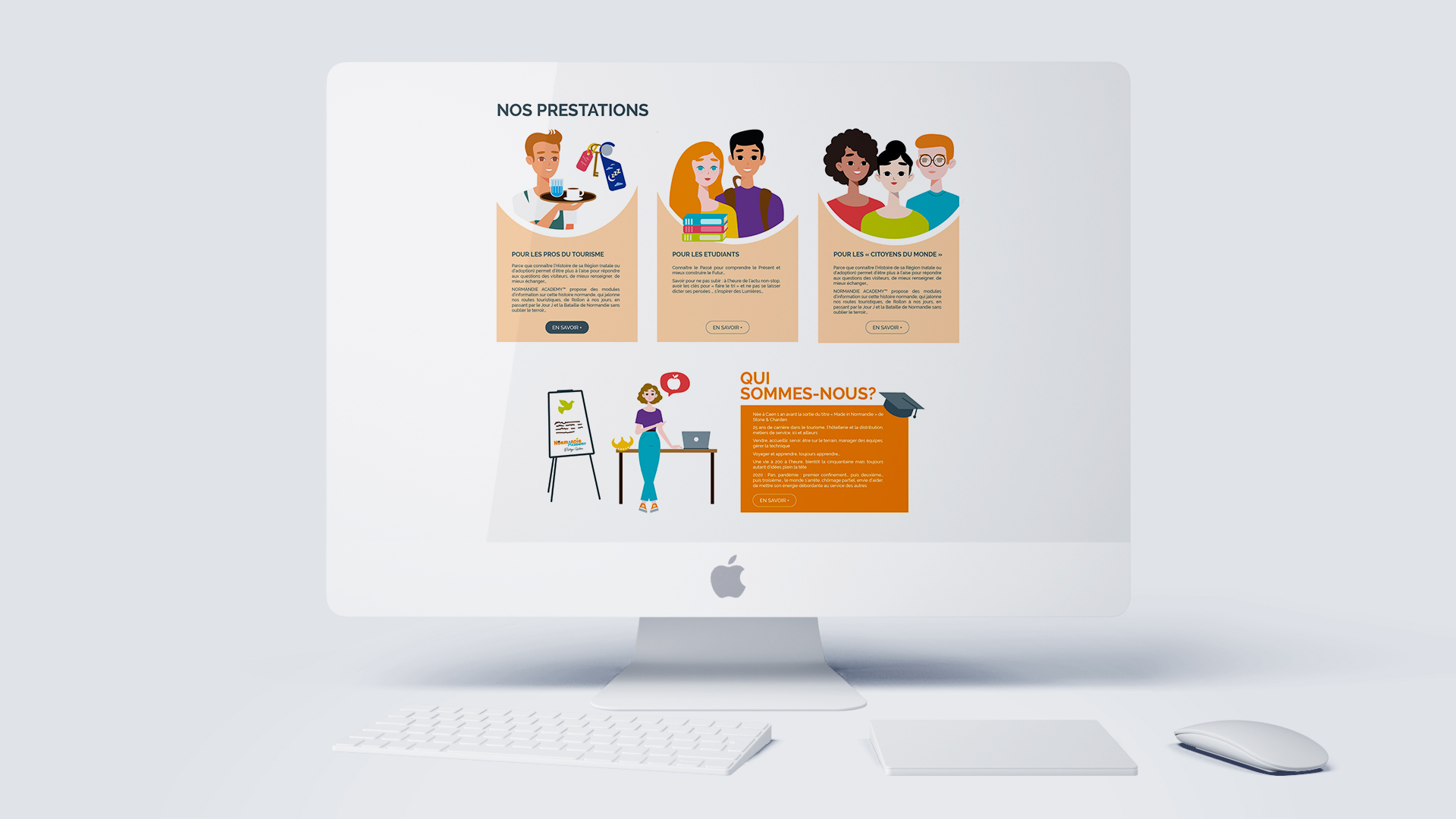 Création de l’identité visuelle pour Nathalie lançant son entreprise : Normandie Académy. Quès aco? Normandie Académy propose aux professionnels du tourisme, aux étudiants et aux citoyens du monde d’en savoir plus sur la Normandie : son histoire, son patrimoine, sa culture… Ainsi, Nathalie m’a demandé de travailler sur la conception graphique de son identité visuelle : un logo, des illustrations sympathiques qui évitent les banques images impersonnelles et le design de son site Internet. Son site est à découvrir ici. Il a été développé par Pablo Gotor et son entreprise Gotor Web marketing. Le travail graphique, c’est dessous!