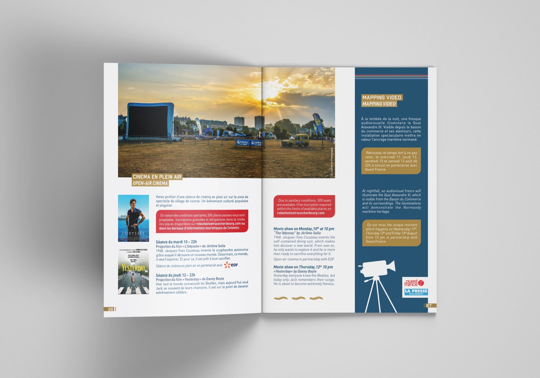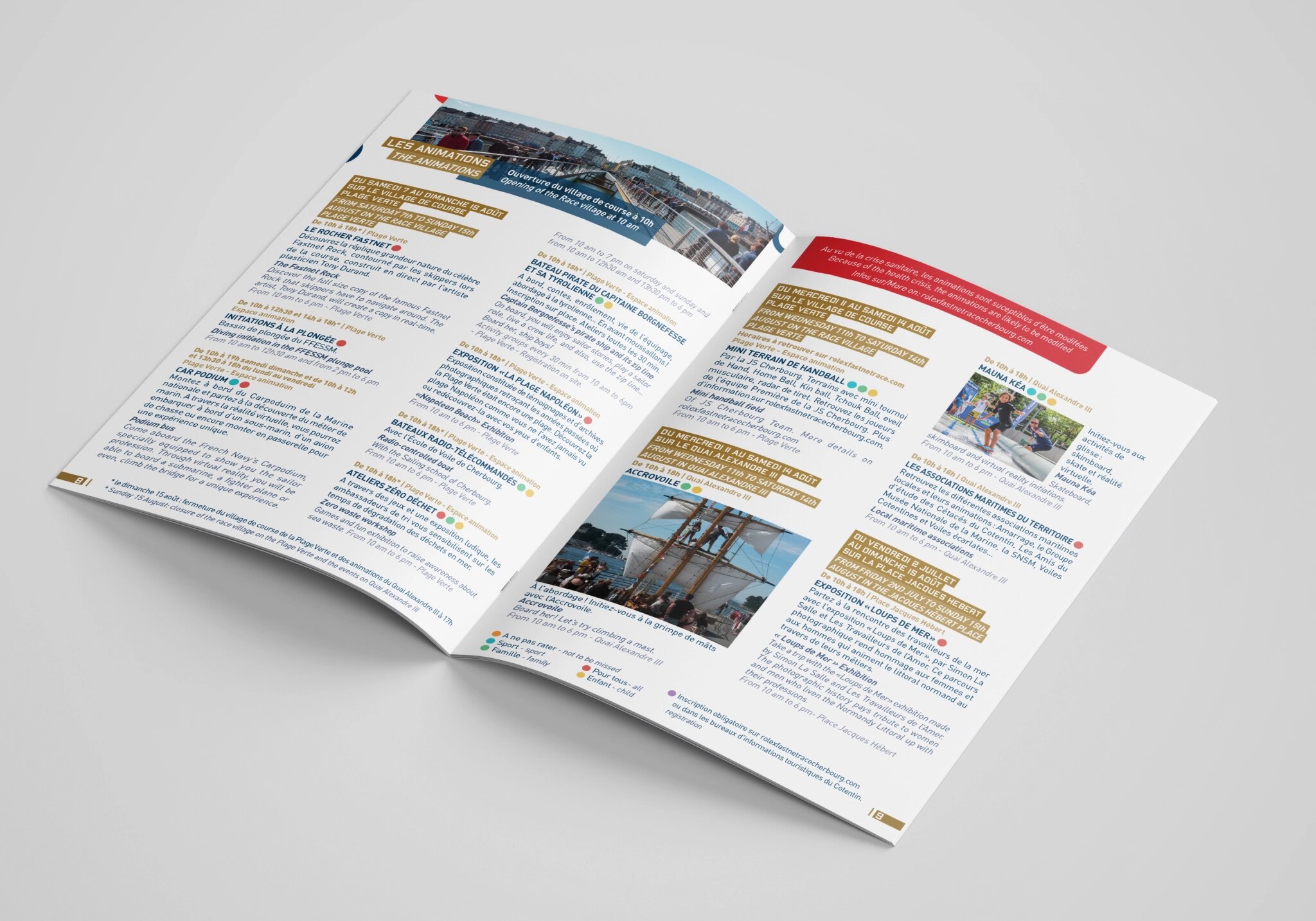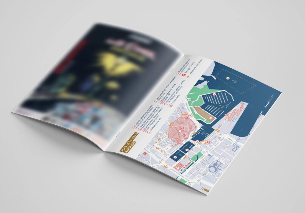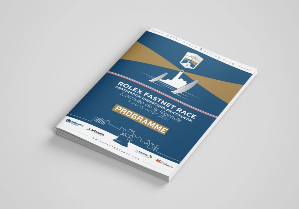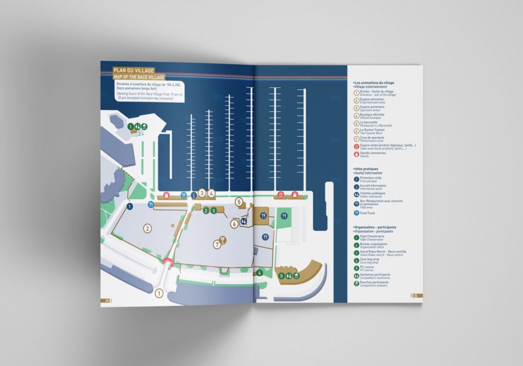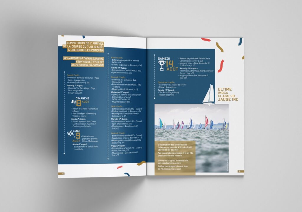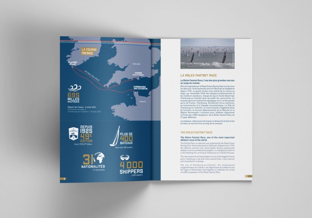 Dans la continuité des supports déjà réalisés pour cet évènement, voici le programme des animations pour la course de la Rolex Fastnet Race 2021. On y trouve aussi les informations pratiques. Cette brochure est en français et en anglais. Ma mission : à partir des textes et photographies fournis par le client, j’ai travaillé sur la conception graphique de la brochure et sur la réalisation des plans. L’univers graphique est respecté et développé suivant les supports déjà édités. Ci-dessous, quelques extraits de la brochure. Pour la version complète, ici.
