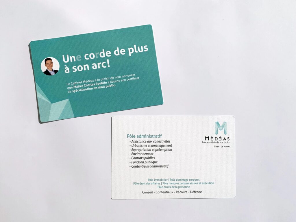 Le cabinet d’avocats Médéas situé à Caen, a fait appel à nouveau à mes services pour annoncer la nouvelle compétence de Me Charles Soublin. Il s’agissait d’en informer sa cible en créant un petit support type carte postale. Un travail qui demandait la reprise de l’identité visuelle créée auparavant pour sa mise en page. Petit défit supplémentaire, trouver un slogan pour annoncer cette nouvelle. Tâche qui n’est normalement pas de mon domaine… Mais qui est parfois possible quand on me laisse un peu plus de temps. Au final client content, défit relevé!