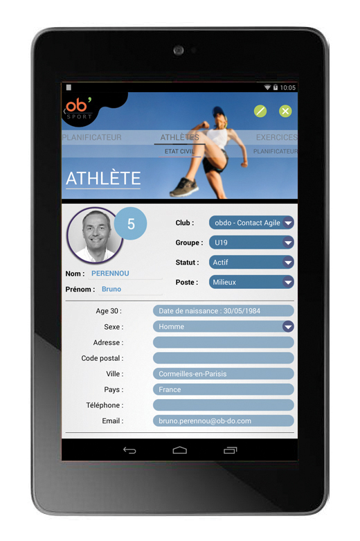 Design de l’application mobile Ob'Do Sport. Réalisation des pictogrammes et illustrations. Application pour les entraineurs, afin de gérer les athlètes (planning, entraînement, match, fiche santé…).